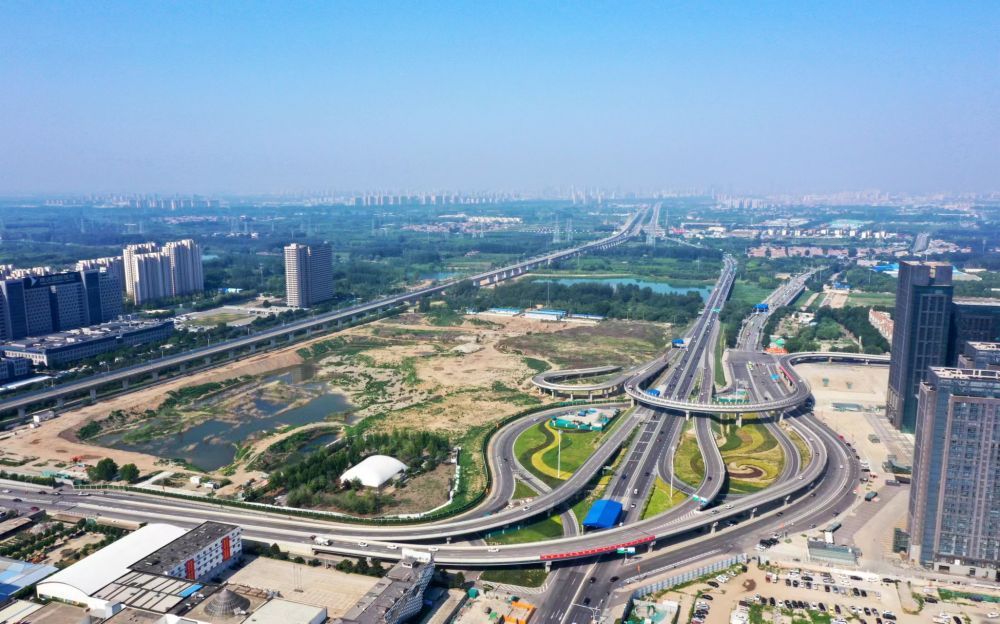 这是2023年7月17日拍摄的京唐城际铁路(燕郊段)及改造后的通燕高速燕郊出口立交枢纽。新华社发