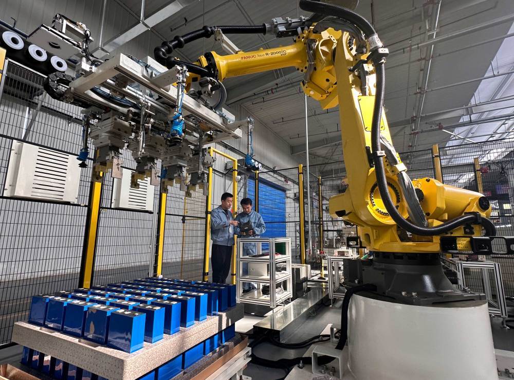 2023年10月17日,欧伏电气股份有限公司第三工厂电池组组装车间,工人正在调试机器人电芯上料。新华社发(高澍 摄)