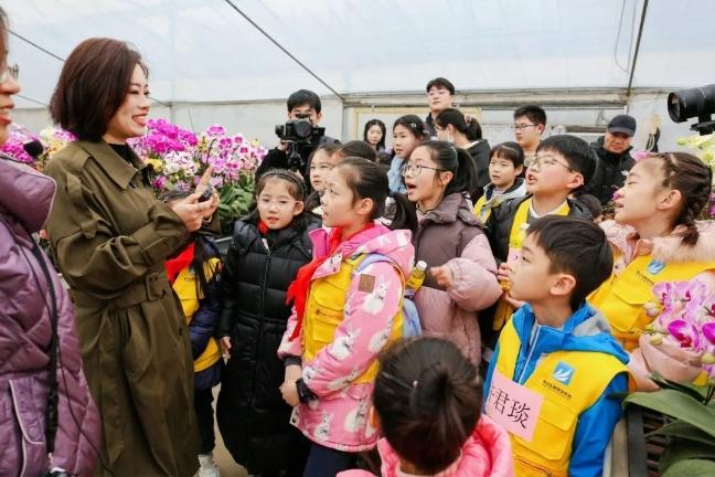 在这里,研学小主播们走进了传化生物,倾听了传化集团的创业故事,化身小记者,玩转采访;与传化生物专家面对面,在母本室和养护苗棚,了解了培育蝴蝶兰的种种步骤,探索了植物克隆的奥秘;最后还用自己的双手,搭配栽植了一份别具特色的蝴蝶兰花艺作品……在冬日里和春天撞了个满怀!