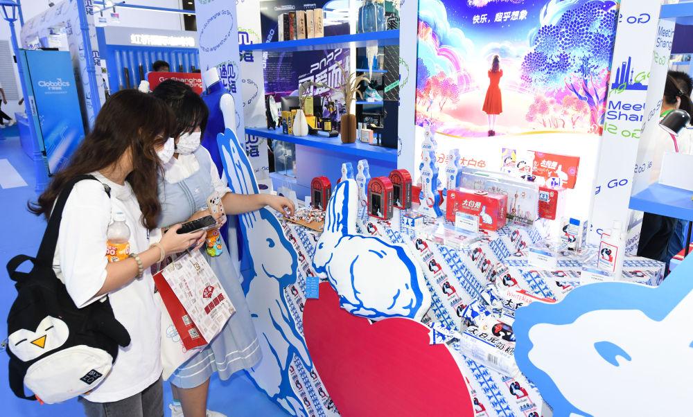 2022年7月28日,观众在消博会上挑选大白兔奶糖。新华社记者 杨冠宇 摄