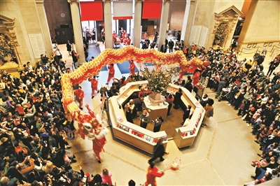 2月3日,在美国纽约大都会艺术博物馆,参观者观看舞龙表演。 新华社发