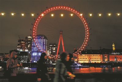 2月8日,在英国伦敦,行人走过亮起红色灯光的“伦敦眼”。 新华社发