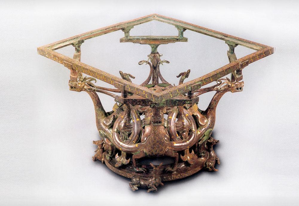 案是我国最古老的家具种类之一,是古人日常放置物品的小桌子,也可用于伏案而息。这件铜方案被发掘出来时,漆制案面已朽,只剩案座。整件文物集铸造、镶嵌、焊接等多种工艺于一体,设计复杂精巧;还施以错金银工艺,金光银彩间双色闪动。