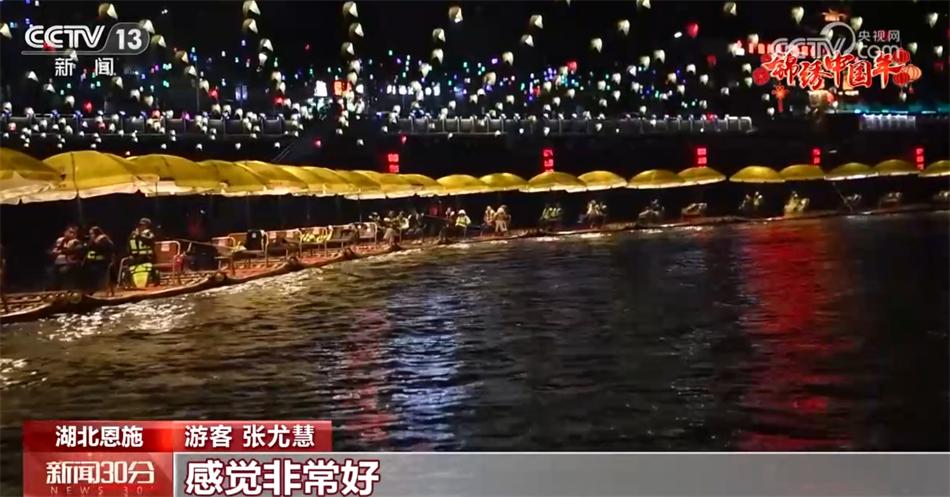在湖北恩施,夜幕下的宣恩贡水河两岸,各色花灯汇成灯的海洋,灯火璀璨、流光溢彩,非常喜庆热闹。各种“龙”元素出现在各个角落,特色美食配美景让这座小城年味更加浓郁。