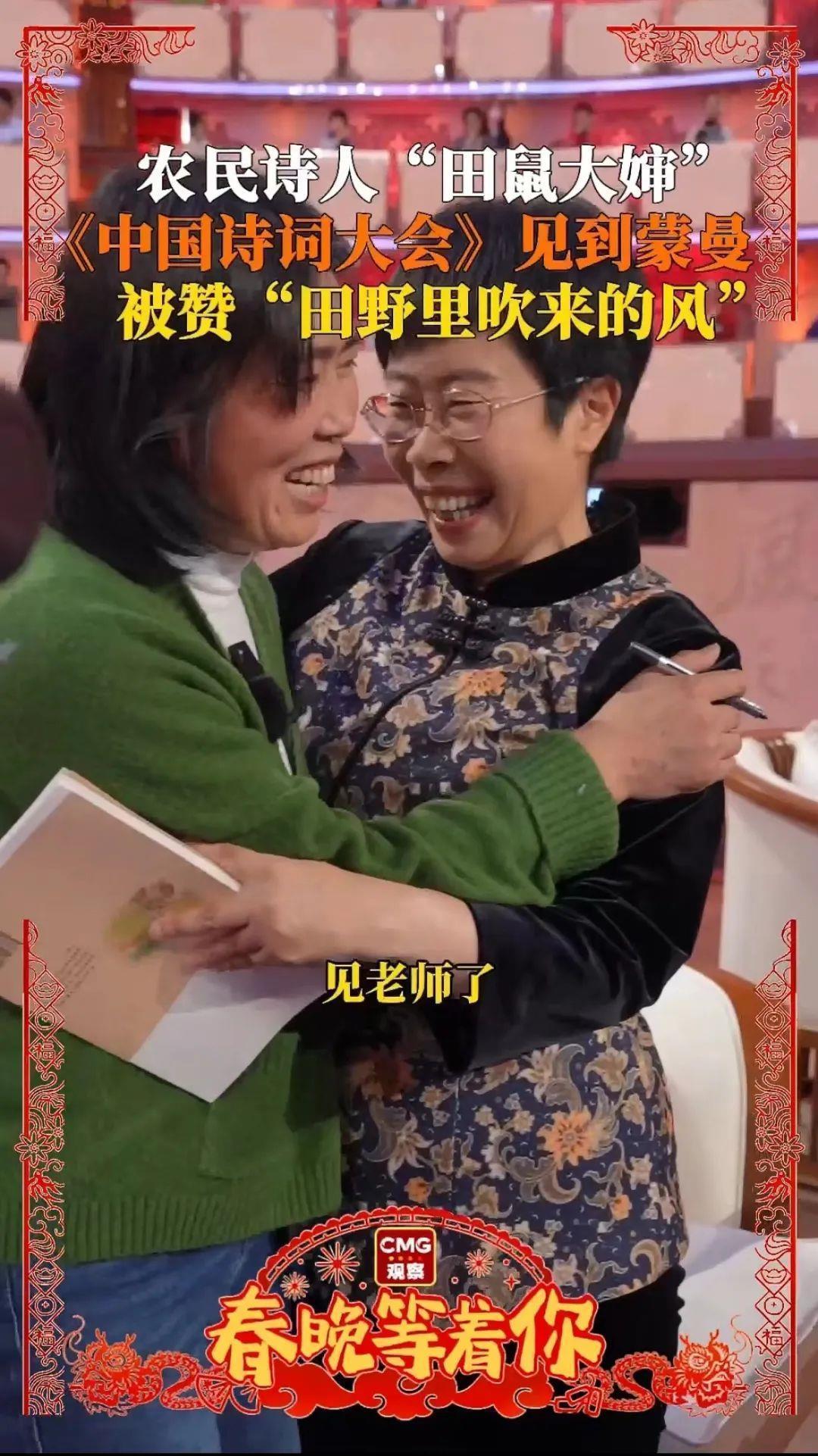 “田鼠大婶”来北京观看了《中国诗词大会》的录制,见到了一直非常喜欢的蒙曼。两个热爱诗词的人相拥在一起,蒙曼形容她是“田野里吹来的风”。