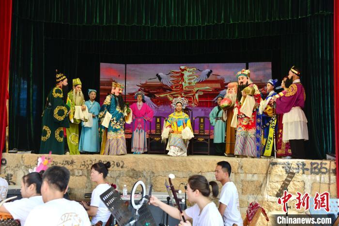 资料图为2023年9月22日,陈禹瑄(右三)和剧团演员们正在漳州市漳浦县深土镇车敖村唱戏。中新社记者 张斌 摄