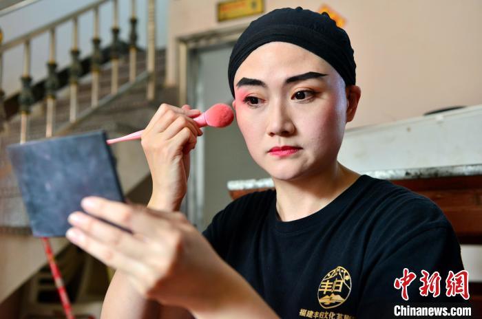 资料图为2023年9月22日,陈禹瑄正在化妆,准备上台演出。中新社记者 张斌 摄