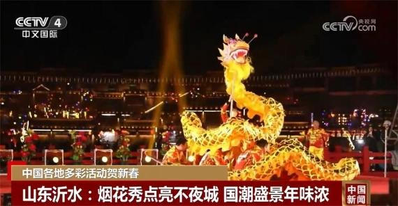在山东沂水,穿越云端的烟花秀点亮了沂水彩虹不夜城的天空,喧天的锣鼓、欢腾的舞龙、热闹的气氛搭配着“有凤来仪”“盛彩敦煌”等随处可见的国潮盛景,仿佛让人穿越千年。