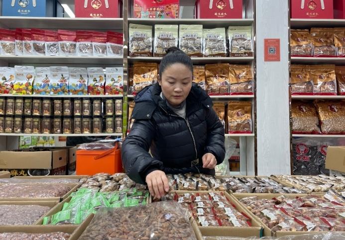 这是湖南长沙高桥大市场坚果经销商李海丽在整理货物。新华社记者 余春生 摄