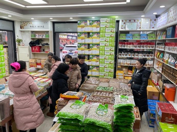 这是湖南长沙高桥大市场坚果经销商李海丽(右一)在向顾客介绍非洲坚果。新华社记者 余春生 摄