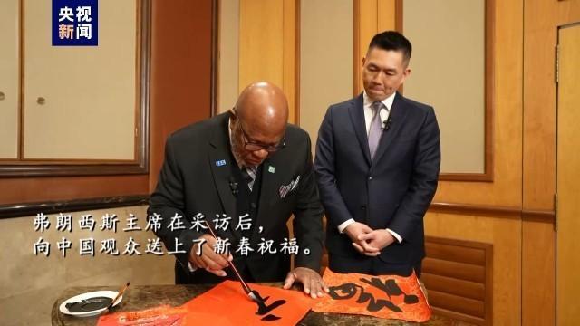王冠:采访结束后,我们邀请联大主席为中国观众送上新春祝福,在描摹中国“福”字的时候,他一丝不苟、认认真真地写了7分钟。他说,不能辜负这个汉字和它背后的美好寓意。他还说,要借用这个“福”字祝广大观众朋友们和全球华人朋友们新春愉快,龙年大吉。
