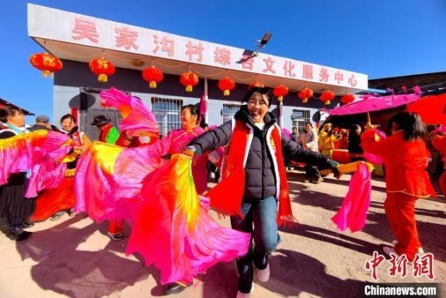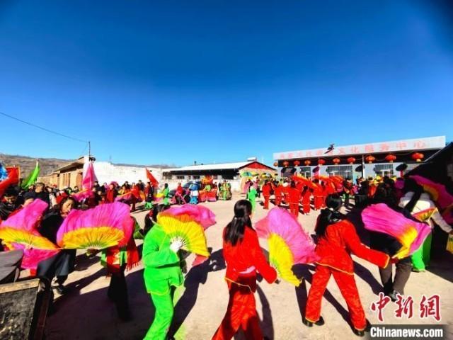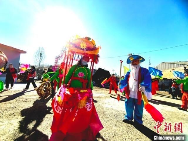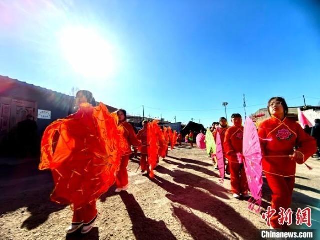 中新网吕梁2月16日电 正月里来是新春,火红的秧歌扭起来。春节期间,山西吕梁方山县马坊镇吴家沟村张灯结彩,150多名村民自发组织秧歌队,在热闹的正月里“扭”出别样风情。