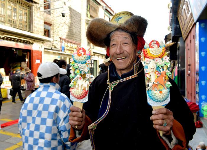 图为:藏族老大爷手里拿着五彩酥油花“孜珠” 中新社 记者 李林摄