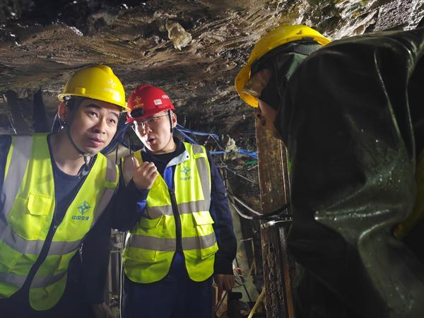 徐树梅(左一)和队友们对大坝进行例行检测。聂灿灿摄