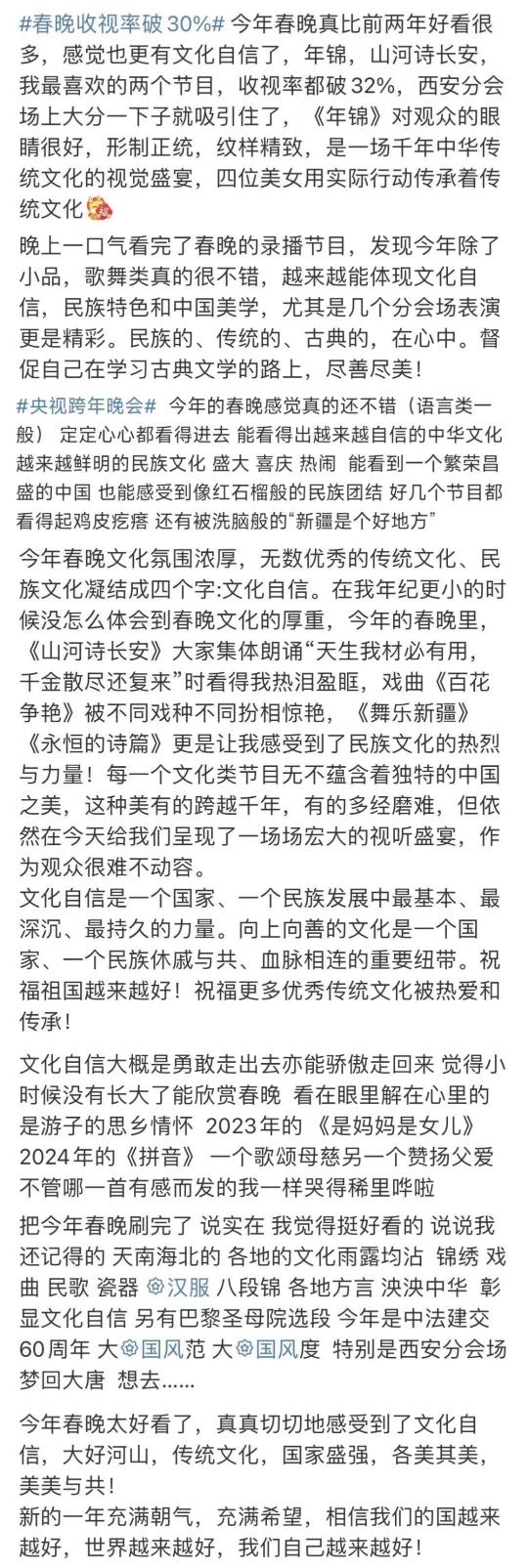 春晚的文化展现,在国人中也引起了热烈反响。“每一个文化类节目都蕴含着独特的中国之美,这种美有的跨越千年,有的多经磨难,春晚给我们呈现了一场场宏大的视听盛宴,作为观众很难不动容”“从今年春晚真真切切地感受到了文化自信,大好河山,传统文化,国家强盛,美美与共”“文化传统特色给各个节目都刷了创意的漆,霸气从节目中升腾,自信从感叹中生发,真妙”......