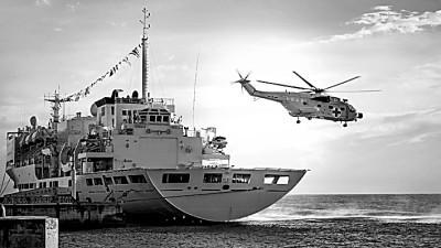 中国海军“和平方舟”号医院船靠泊所罗门群岛霍尼亚拉港期间,舰载医疗救护直升机开展巡诊服务。新华社发