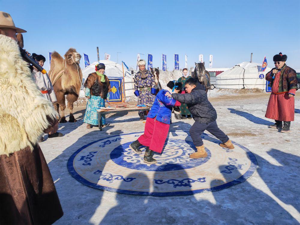 为迎接“十四冬”,呼伦贝尔推出了丰富多彩的文化活动和产品。陈巴尔虎旗的牧民巴图苏和与合伙人在莫尔格勒河景区推出“天天冰雪那达慕”活动,设雪地搏克、骑马射箭、“冰地嘎拉哈”、骆驼爬犁等项目,让游客沉浸式体验蒙古族文化与传统运动。首次尝试雪地搏克的河北固安游客张瑞堂,与一位蒙古族少年友好竞技,他的姐姐则用手机记录下了这段珍贵的经历。