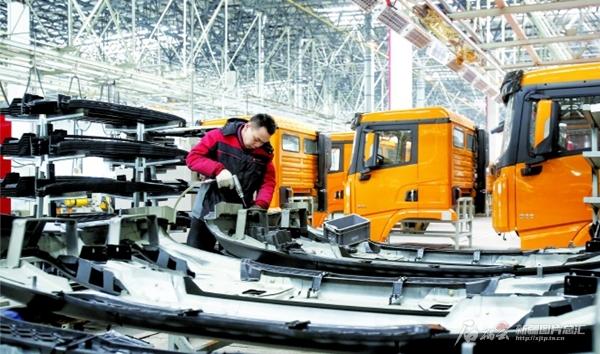 2月19日,工人在位于乌鲁木齐经济技术开发区(头屯河区)的陕汽新疆汽车有限公司生产车间作业。今年,该企业已接订单862辆,其中396辆为出口订单,实现“开门红”。 记者 谢龙 摄