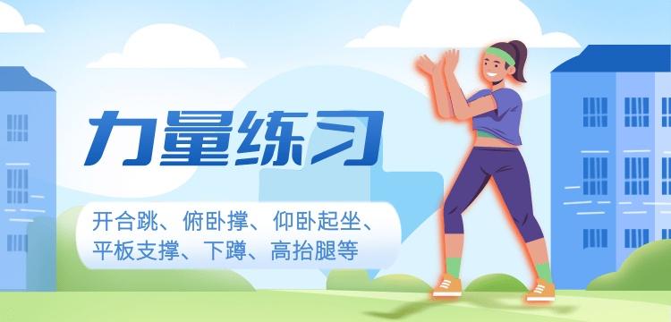 开合跳主要锻炼下肢和腰腹肌肉力量,主要动作是双脚往外张开约1.5倍肩宽,双手往头顶方向击掌,手肘尽量伸直,在头部两侧夹紧,身体向上延伸。