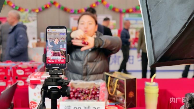 1月18日,第二届新发地年货节暨集采集配节在北京开幕,商户通过现场直播售卖车厘子(央广网记者 朱冠安 摄)