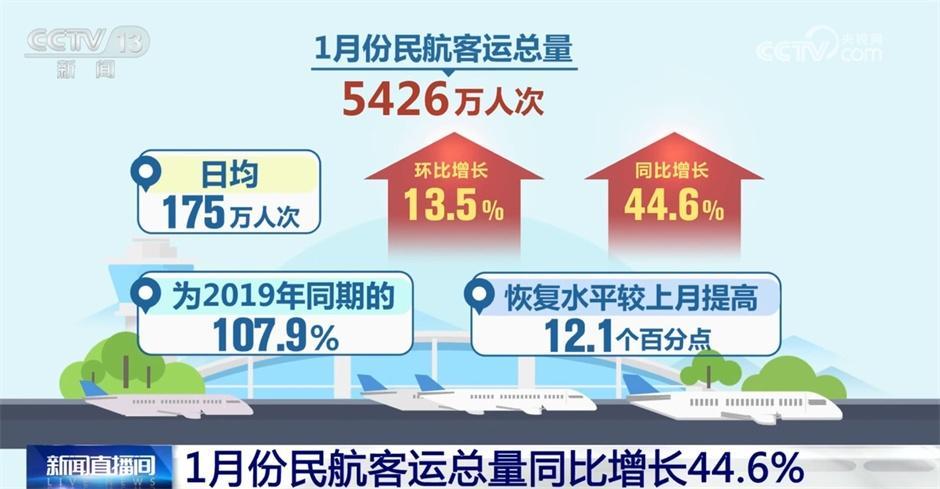 今年1月份我国民航旅客运输量明显提升,国际客运市场恢复水平不断提升。