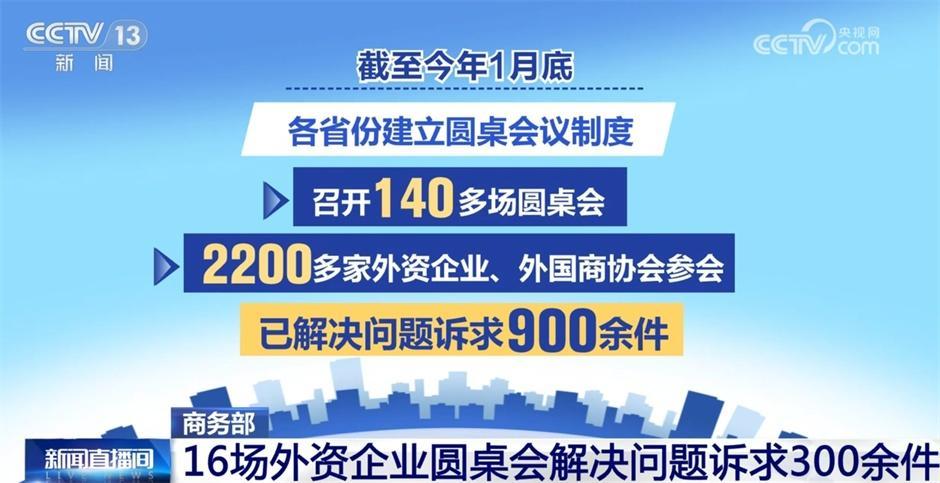自2023年7月起,商务部建立外资企业圆桌会议制度,定期召开会议听取外资企业反映困难问题和意见建议,并会同相关部门和地方共同推动解决。截至今年1月底,商务部已召开16场外资企业圆桌会,共400多家外资企业、外国商协会参会,已解决会上反映的问题诉求300多件。同时,各省份也建立圆桌会议制度,召开140多场圆桌会,2200多家外资企业、外国商协会参会,已解决问题诉求900余件。
