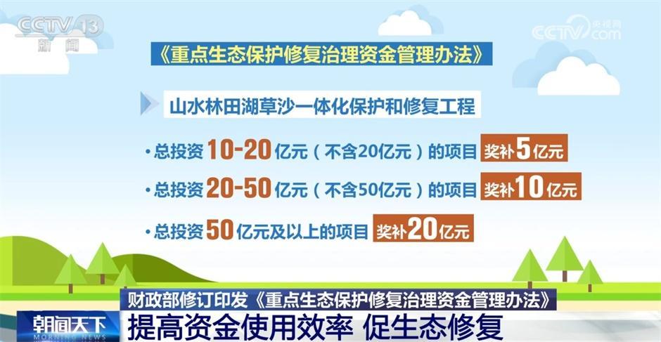 资金具体怎么分配?新办法指出,山水林田湖草沙一体化保护和修复工程总投资10亿元—20亿元(不含20亿元)的项目奖补5亿元;工程总投资20亿元—50亿元(不含50亿元)的项目奖补10亿元;工程总投资50亿元及以上的项目奖补20亿元。历史遗留废弃工矿土地整治总投资5亿元及以上的项目奖补3亿元。