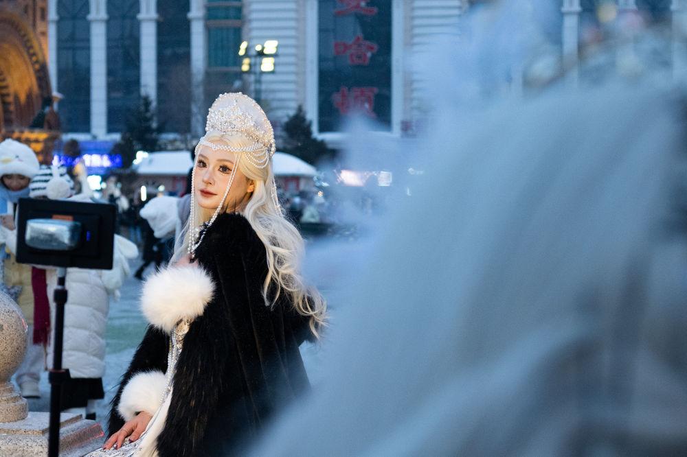 1月12日,游客在哈尔滨建筑艺术广场盛装拍摄写真。新华社记者 谢剑飞 摄