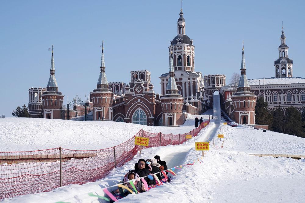 1月7日,游客在伏尔加庄园玩雪圈。新华社记者 王建威 摄