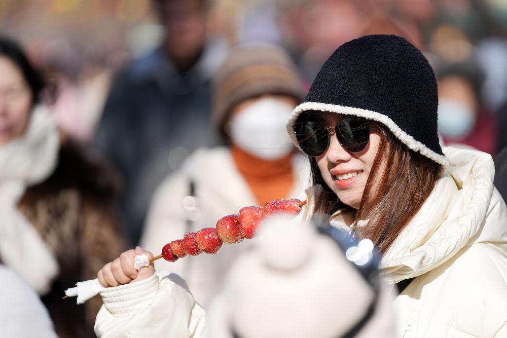 2月12日,游客在哈尔滨百年老街中央大街品尝草莓冰糖葫芦。新华社记者 王建威 摄