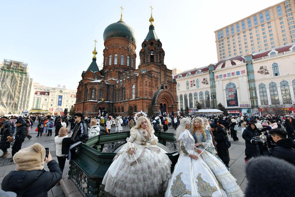 2月12日,旅拍游客在哈尔滨建筑艺术广场身着盛装拍照。新华社记者 王建威 摄