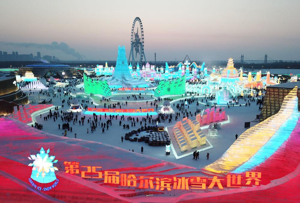1月3日,游客在哈尔滨冰雪大世界园区内游玩。新华社记者 王建威 摄