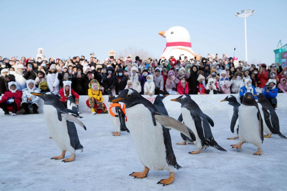 2月13日,游客在哈尔滨极地公园广场观看企鹅巡游。新华社记者 王建威 摄