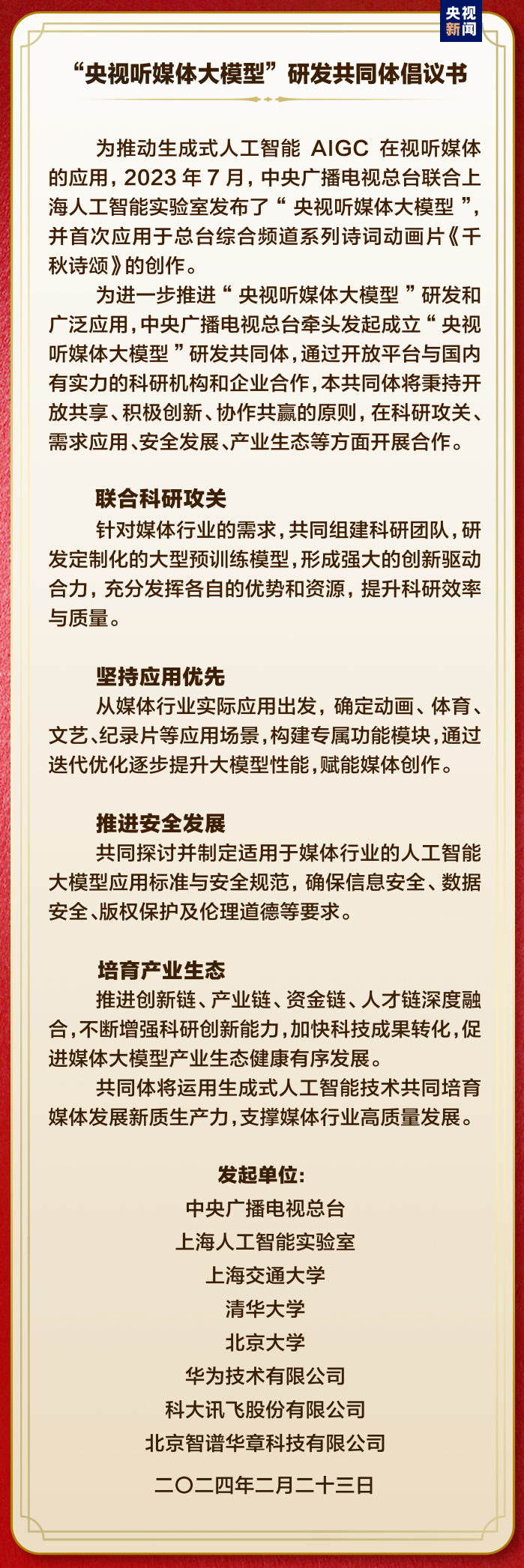 活动上,中央广播电视总台牵头发起成立“央视听媒体大模型”研发共同体,通过开放平台与国内一流的科研机构、高校和企业在科研攻关、需求应用、安全发展、产业生态等方面加强合作,联动产业链上下游,运用生成式人工智能技术为视听媒体科研创新提供支持,打造新质生产力,助力总台高质量发展。