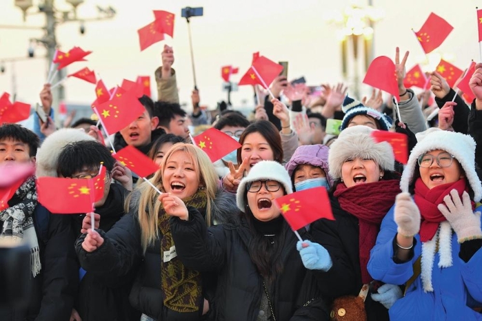 北京天安门广场举行隆重的升国旗仪式。图为观众在升旗仪式结束后欢呼(2024年1月1日摄)陈钟昊摄