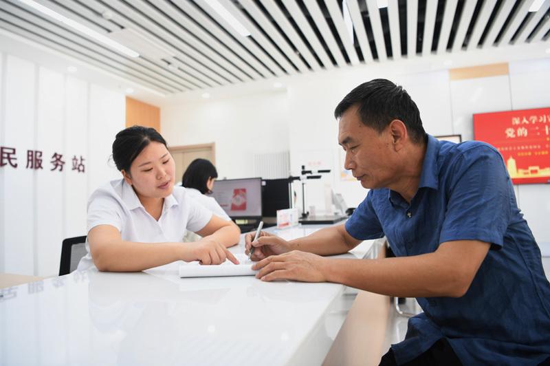 2023年5月23日,河北雄安新区容东片区南文营社区居民(右)在社区便民服务站办理业务。