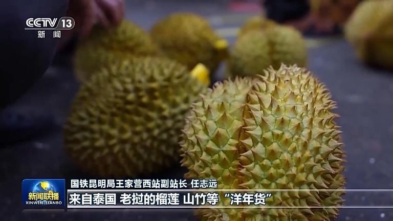 国铁昆明局王家营西站副站长 任志远:今年以来,车站进出口货物明显增加,来自泰国、老挝的榴莲、山竹等“洋年货”源源不断运抵。国内的“国货潮牌”陆续运往东南亚国家。