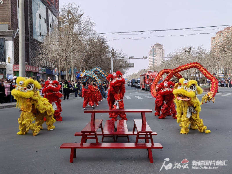 舞龙队、舞狮队各展风采。各代表队有序跟进,随着吉木乃出入境边防检查站威风锣鼓队鼓声响起,团机关秧歌队也随舞而动,为社火游行队伍增添了欢快的色彩。游行结束,各支队伍来到机关广场上载歌载舞。大头娃娃队、民族舞队、骑驴扇子舞队、旱船队争芳斗艳,缤纷热闹的表演为观众们带来一场文化盛宴。