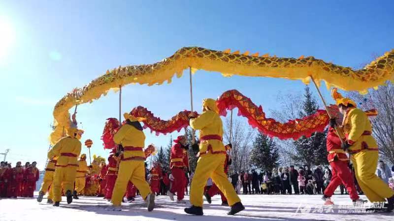 2月24日,吉木乃县直部门单位和驻地群众社火游行队伍走上街头带来精彩表演。这里舞龙队在表演。张福新 摄
