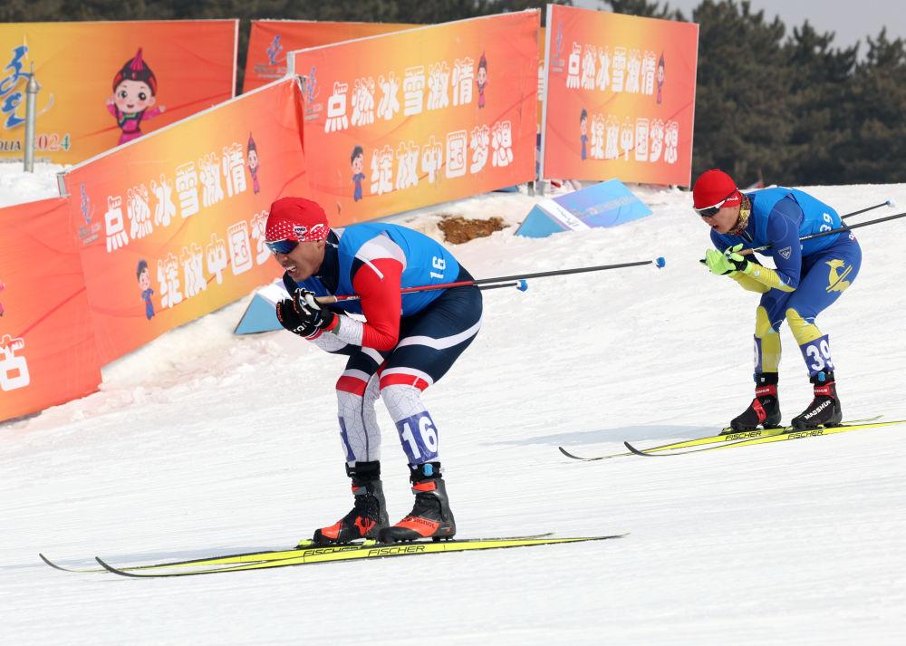 ↑2024年2月24日,吐尔松江·布尔力克(左)在第十四届全国冬季运动会越野滑雪公开组男子50公里集体出发(传统技术)比赛中。