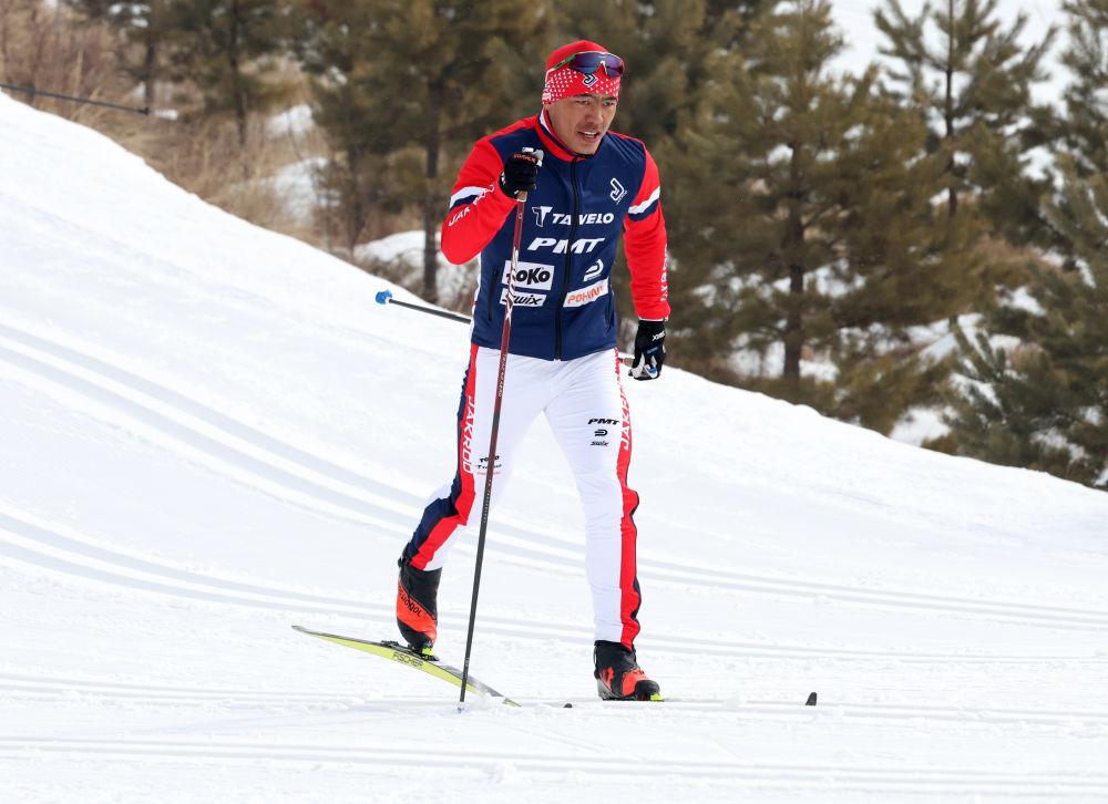 ↑2024年2月24日,吐尔松江·布尔力克(左)在第十四届全国冬季运动会越野滑雪公开组男子50公里集体出发(传统技术)项目比赛前热身。