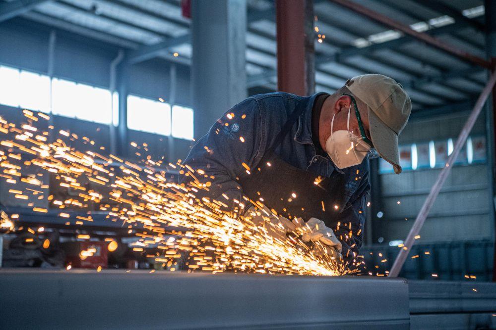 2月22日,在位于重庆市大足区的施密特电梯有限公司生产车间内,工作人员在生产线上进行焊接作业。新华社记者 唐奕 摄