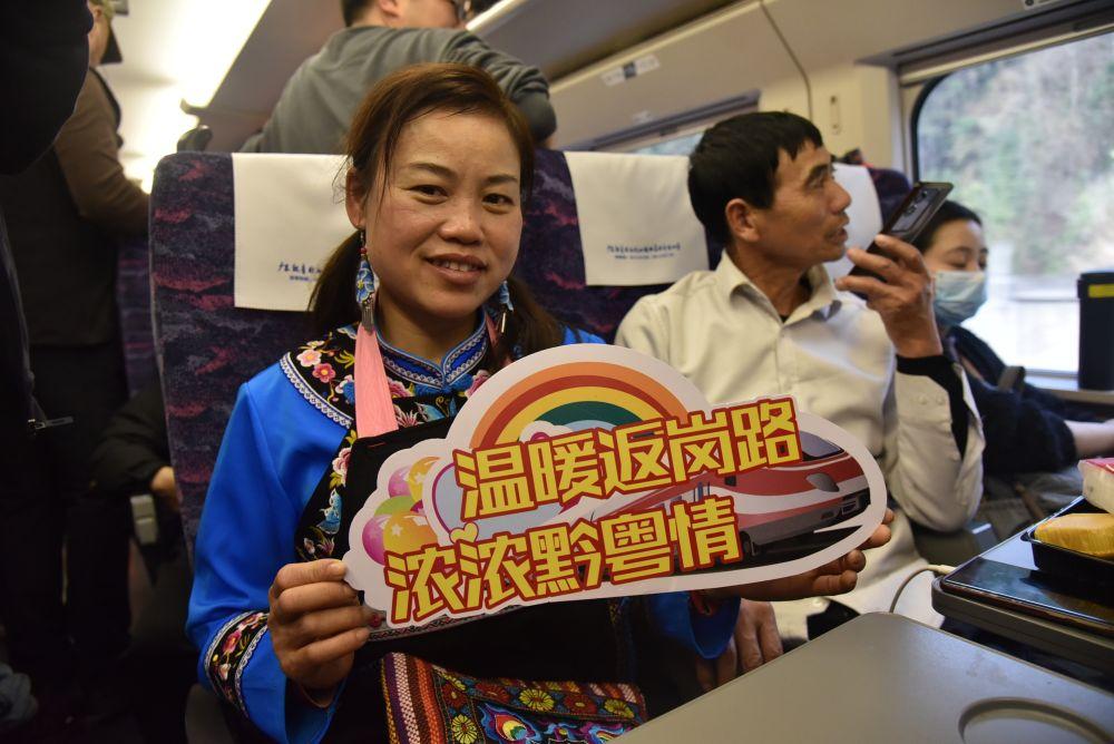 2月18日,D1859次列车抵达广州南站,这是一趟东西部劳务协作返岗专列,车上搭载了600多名来自贵州的务工人员。广东省就业服务管理局局长夏义兵说,“这次专列都是以贵州、广西为主,因为它是我们东西部劳务协作的省份,帮助他们的农民工尽快地返岗就业。”