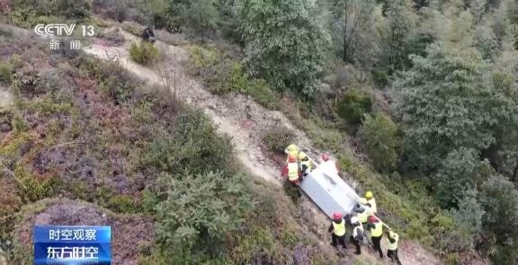 将第一批组件成功运往目的地后,无人机很快又飞回来,准备再次运输。往返几次下来,大部分设备都成功运往高山上的目的地。然而有些大家伙还是需要人工作业。虽然是正午时分,但高山上的气温仍然逼近零摄氏度,面对近60度倾角的山坡,江涛他们不得不停下脚步。