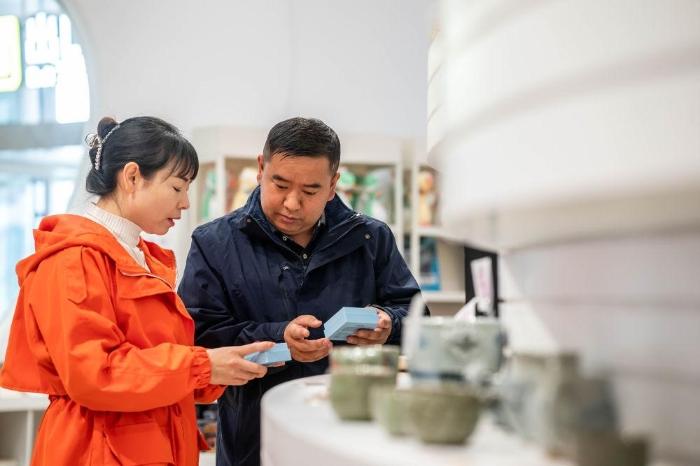 郭进(右)在澄江化石地世界自然遗产博物馆和工作人员交流文创产品设计方案(2月23日摄)。
