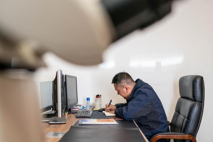 郭进在澄江化石地世界自然遗产博物馆办公室写科研材料(2月22日摄)。