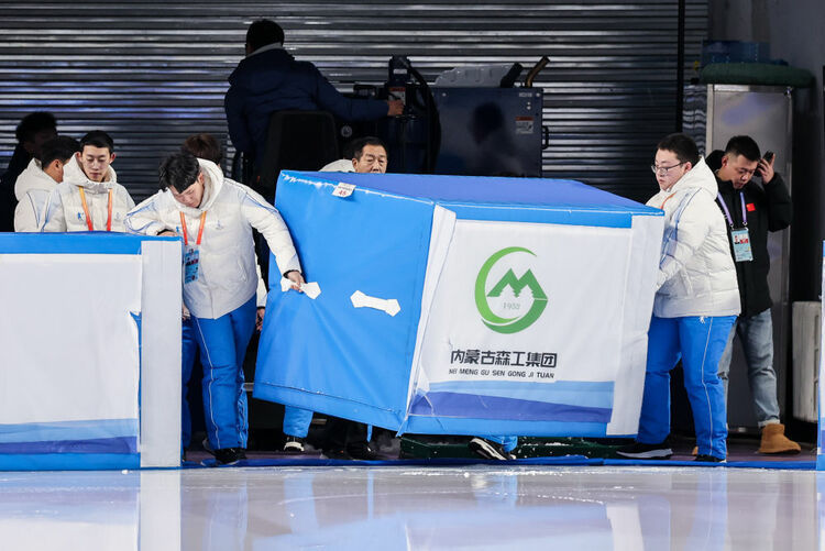 2月18日,在内蒙古冰上运动训练中心短道速滑馆,志愿者们在赛前搬运赛场边的防撞垫。新华社记者 李博 摄