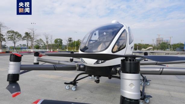 广州无人驾驶载人航空器科技企业副总裁 贺天星:比较轻,全机身是碳纤维。做到轻量化也是为了安全的保证。(这是我们)完全自主研发的产品。