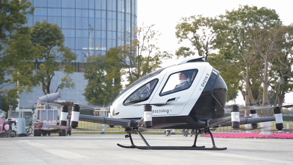 这家广州无人驾驶载人航空器科技企业的副总裁贺天星告诉我,这架未来的“空中出租车”EH216-S在2023年10月成为全球首个获得型号合格认证的无人驾驶载人电动垂直起降航空器。它的自重是430公斤左右。