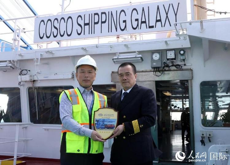 中远海运港口阿布扎比码头有限公司总经理陈玉平(左)登上“中远海运银河”轮,向船员表示慰问,并向船长谢卫国赠送纪念牌。人民网 纳达尔·达乌德摄